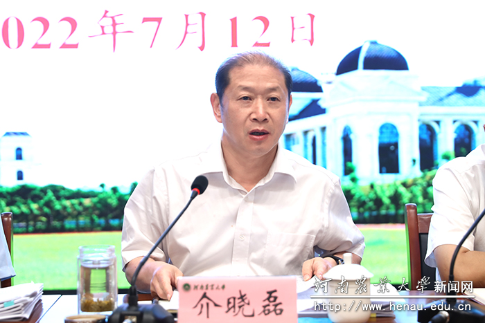 介晓磊对暑期具体工作进行了安排部署:一是要做好120周年校庆总结工作。120周年校庆是农大人的加油站、里程碑、新起点,是一种历练、一种成长、一种体验、一种能力作风的提升,更是超越发展的契机。要巩固拓展校庆成果,落实相关合作协议,将之作为奋楫扬帆、继往开来的新机遇,推动学校各项工作再上新台阶。二是要做好巡视整改工作。要提高政治站位,按照校党委的统一安排,把巡视整改工作同校领导经济责任审计持续整改结合起来,同教学、科研、管理、服务等各项工作结合起来,同“能力作风建设年”活动结合起来,确保巡视反馈问题整改到位、落实到位。三是要做好疫情防控工作。要不松气、不懈怠、不麻痹,全面从紧从实从细落实好《新型冠状病毒肺炎防控方案(第九版)》和省疫情防控方案3.0版要求,全面加强风险排查和研判工作,进一步完善疫情防控应急预案,严格落实扫码测温、消毒消杀、人员管控等制度,坚决打好此轮疫情阻击战。四是要推进重点工作。要对标对表年度工作计划,认真查摆梳理,及时总结上半年工作,重点推进新一轮人才培养方案修订、深化专业改革、创建世界一流农业大学方案、“学科特区”政策落地、校企校地合作协议落实以及人才招聘、重大平台建设、毕业生就业、招生录取、暑期社会实践等各项工作落细。五是要推进基本建设工作。要认真做好龙子湖校区二期工程配套设施完善、工程竣工验收以及加快推进三期工程建设、幼儿园建设等方面工作。要加快推进新乡科教园区、海南南繁基地和信阳农科教人才培养基地建设,推进第二实验楼6个学院的搬迁工作,进一步完善“三校区、五基地”办学格局。六是要做好安全稳定工作。要从维护学校稳定和师生安全的高度出发,坚持底线思维,筑牢意识形态工作阵地,从确保学校各项工作正常运转的大局出发,压实安全责任,扎实做好疫情防控、防洪防汛、在校师生人身安全、供电设备安全运转、实验室安全等方面工作,确保校园暑期平稳运行。七是做好值班值守和后勤服务。严格执行处级以上干部离郑报备等相关要求,保持通讯畅通,确保暑期工作不断线,遇到特殊情况能及时处置。要组织力量对相关损坏设施进行维修维护,确保学校各项保障服务正常运转。