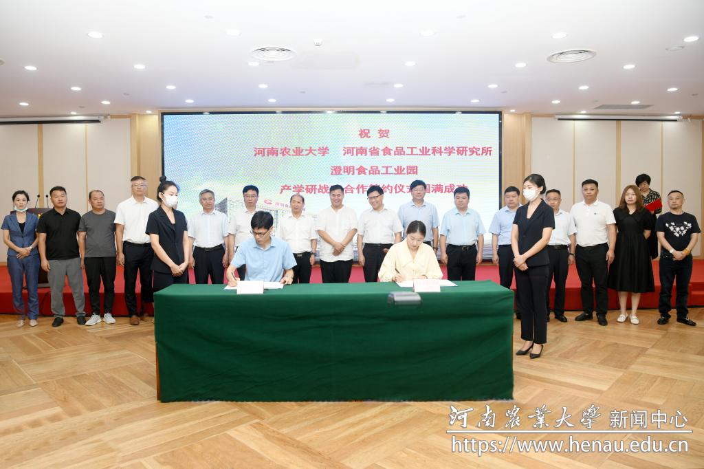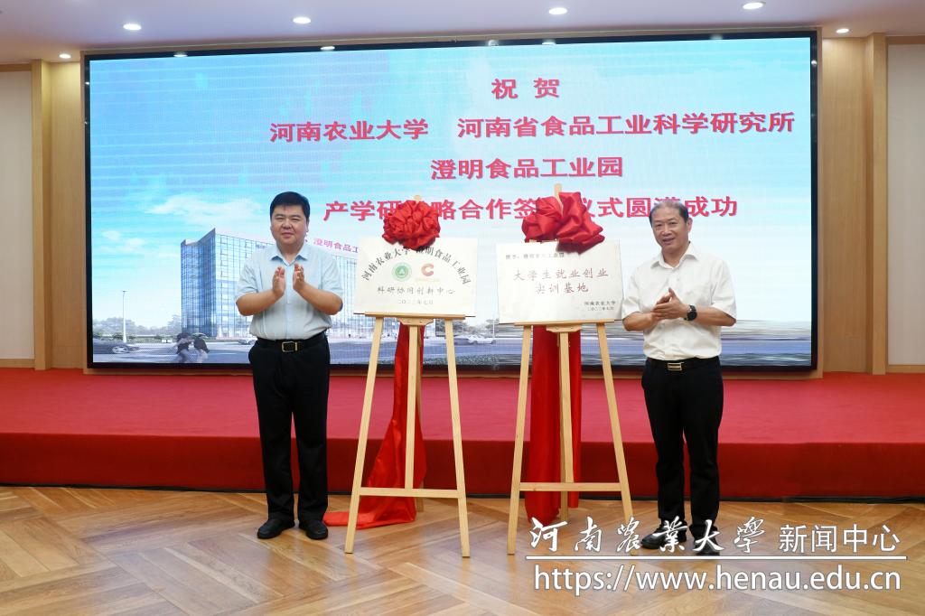 双方共同为“河南农业大学澄明食品工业园科研协同创新中心”、“河南农业大学大学生就业创业和实训基地”揭牌