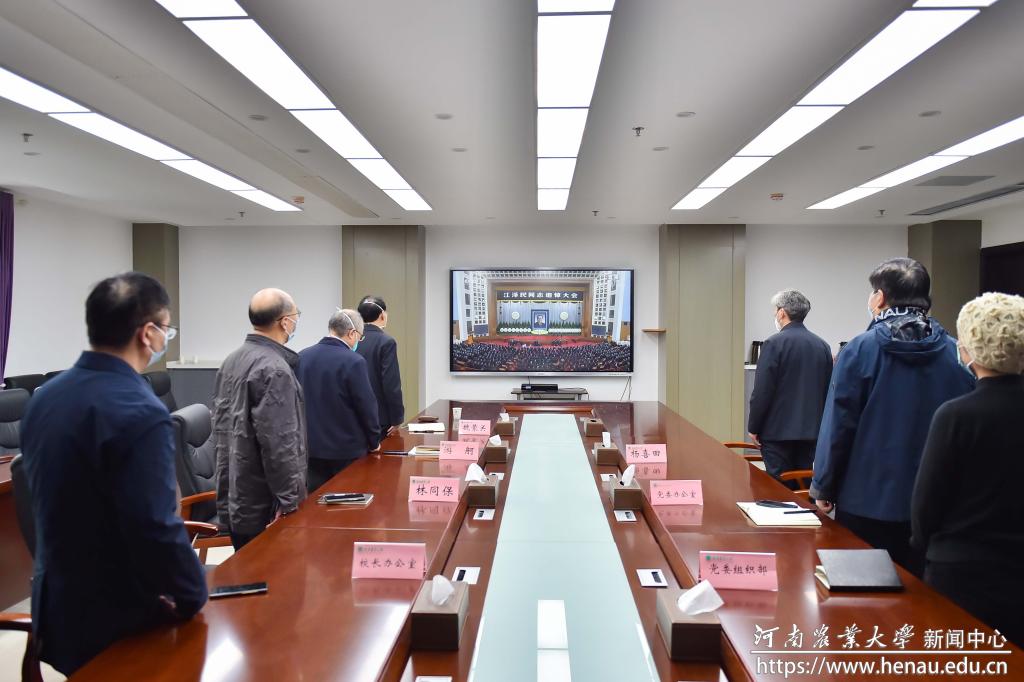 12月6日清晨,学校下半旗志哀。上午10时,在校校领导、校党委委员、有关职能部门负责人在龙子湖校区综合楼318会议室集中收看追悼大会。会议室庄严肃穆,参会人员怀着悲痛的心情,集体默哀3分钟,并跟随追悼大会齐唱中华人民共和国国歌,认真聆听悼词,满怀敬意地送别江泽民同志。参会人员一致表示,要响应党中央号召,化悲痛为力量,赓续红色血脉、续写奋斗篇章,更加自觉地团结在以习近平同志为核心的党中央周围,深入学习宣传贯彻党的二十大精神,提振士气、踔厉奋发,为全面建设社会主义现代化国家、全面推进中华民族伟大复兴贡献农大力量。