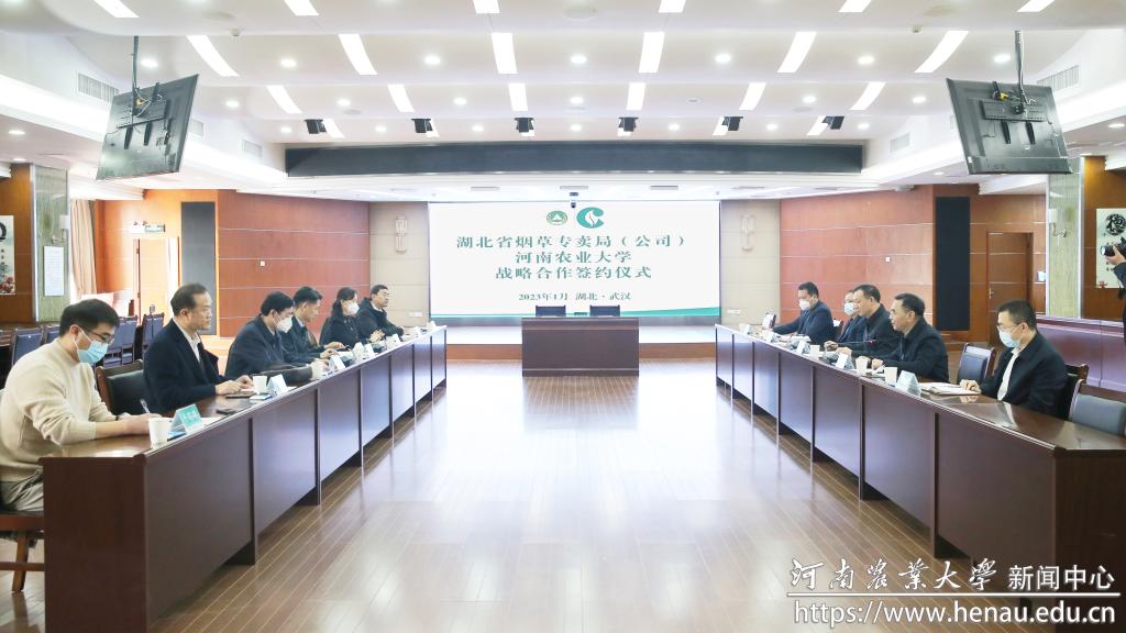 本网讯(通讯员 牛路路 图片 任天宝)1月4日,学校与湖北省烟草专卖局战略合作签约仪式在武汉举行。副校长刘晓永、湖北省烟草专卖局副总经理龚春竹出席仪式。科技处、社会服务处、烟草学院、专卖局相关部门负责人参加活动。