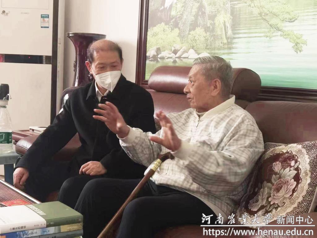 介晓磊一行详细询问胡廷积教授的生活和身体情况,聆听他讲述在上世纪70年代牵头创立“河南小麦高稳优低研究推广协作组”的光荣事迹,并代表学校送上慰问品。