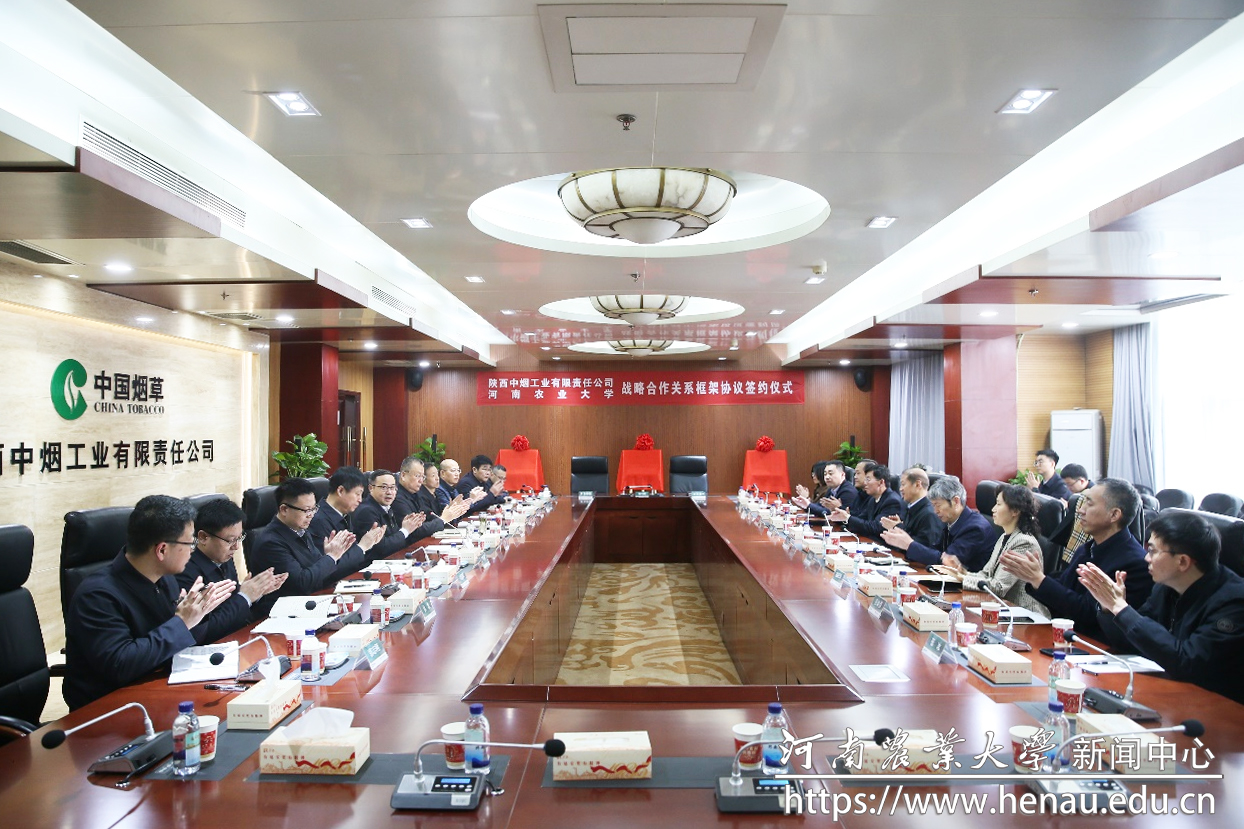 本网讯(通讯员 崔冰 图片 付博)2月27日,学校与陕西中烟工业有限责任公司在西安签署战略合作协议。校长介晓磊、副校长杨喜田,陕西中烟总经理王茂林、副总经理李宝新出席仪式。社会服务处、烟草学院、陕西中烟相关部门负责人参加活动。