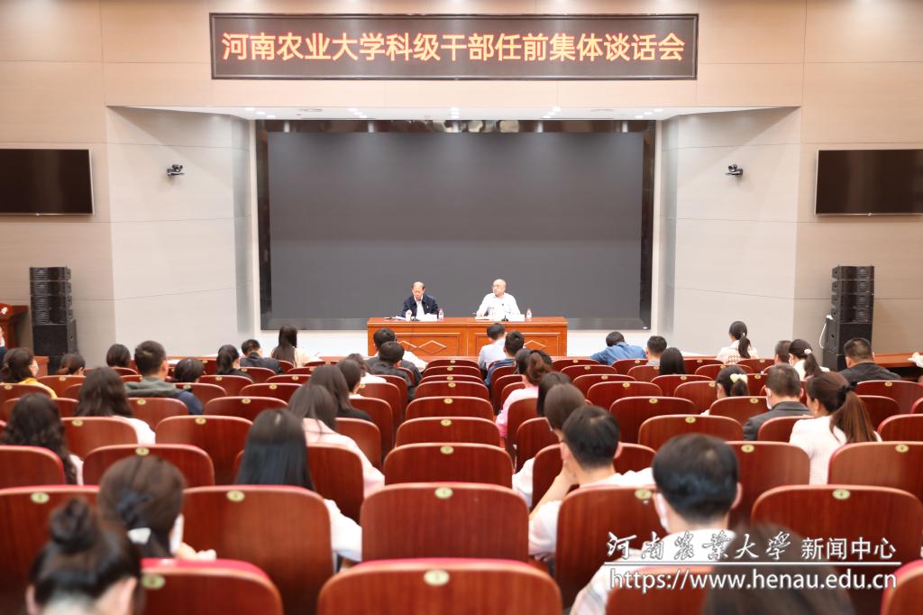 本网讯(通讯员 张世昌 图片 黄璞)3月8日下午,我校在龙子湖校区综合办公楼120会议室召开科级干部任前集体谈话会。校长介晓磊、校党委副书记游舸出席会议,校党委组织部负责人及新任职的132名科级干部参加会议。会议由游舸主持。