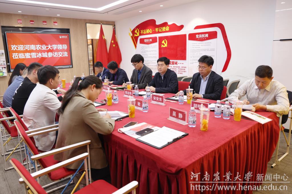 蜜雪公益基金负责人杨宇简要介绍了蜜雪集团的企业文化、发展历程、品牌布局、产业模式、社会责任和发展愿景。蜜雪集团相关负责人表达了蜜雪冰城股份有限公司与河南农业大学的合作意愿,并就合作原则、合作方向、合作方式、合作内容等方面进行了详细说明。
