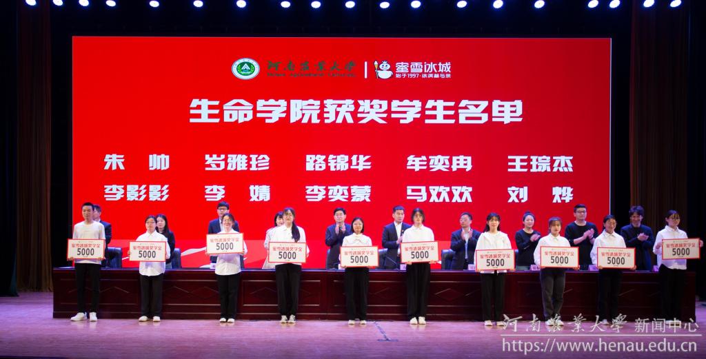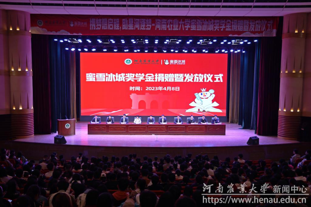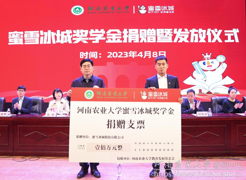 蜜雪集团向学校捐赠100万元人民币,设立河南农业大学蜜雪冰城奖学金。与会领导嘉宾为获奖学生颁奖。