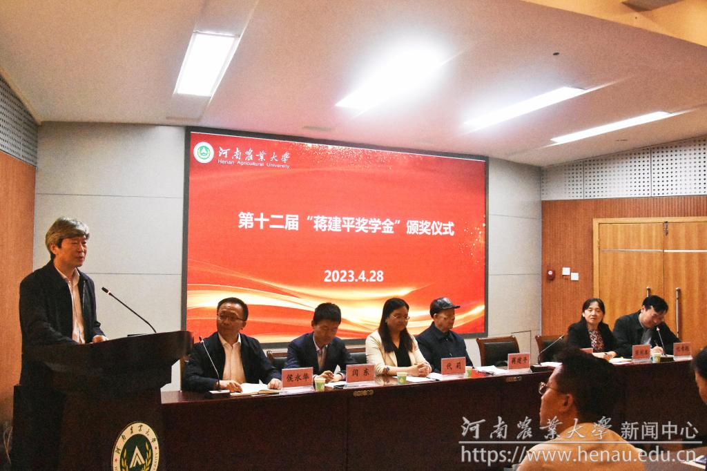 本网讯(通讯员 田原 图片 胡悦)4月28日,第十二届“蒋建平奖学金”颁奖仪式在文化路校区举行,副校长杨喜田、河南农业大学原校长蒋建平教授出席活动。学校相关职能部门负责人,林学院、风景园林与艺术学院师生代表参加活动。