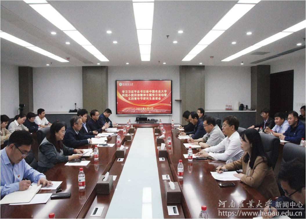 本网讯(通讯员 王朝杰 熊宇钰)5月4日,学校召开学习习近平总书记给中国农业大学科技小院回信精神主题党日活动暨河南农业大学2023年五四青年节研究生座谈会。副校长尚富德出席会议。研究生院、党委研工部、河南省科技小院联盟有关负责人及科技小院师代表参加会议。
