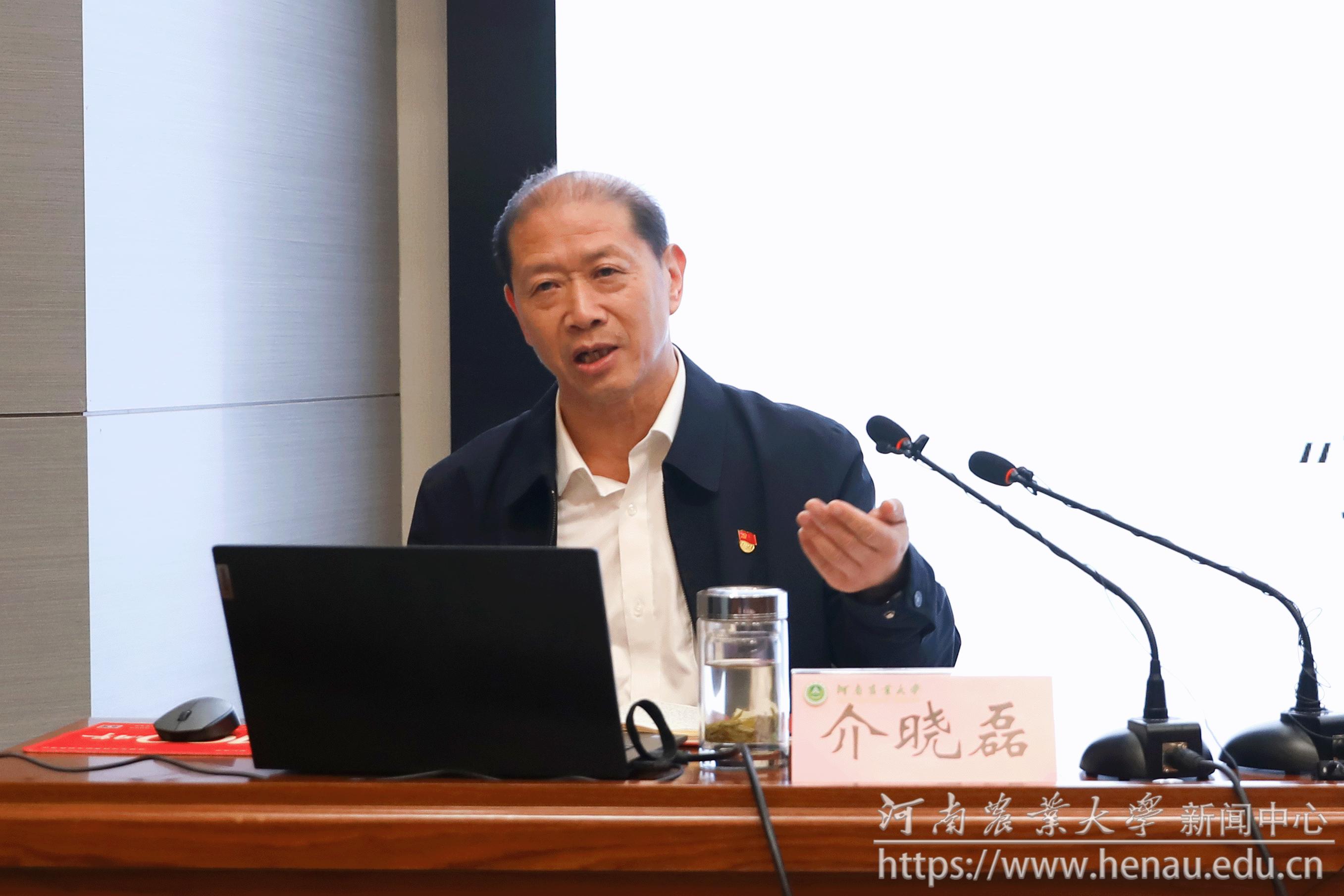 介晓磊以《认真学习践行党章做新时代党的好干部》为题为党员领导干部讲了一堂既有理论深度、又有实践精度的主题教育专题党课。他指出,一是要认真学习贯彻《中国共产党章程》修正案。要充分认识党章的根本地位,准确把握党章修正案的丰富内涵,紧密结合高校党建工作的实践要求,坚定落实习近平总书记的重要指示。二是要牢牢把握党的干部的基本条件。牢记党员必须履行的八条义务,对标对表党的干部六项基本条件,不断增强“四个意识”、坚定“四个自信”、做到“两个维护”,争做信念坚定、为民服务、勤政务实、敢于担当、清正廉洁的好干部。三是要严格履行习近平总书记对党的干部的具体要求。深学细照笃行焦裕禄精神,做政治的明白人、发展的开路人、群众的贴心人、班子的带头人,善于从政治上看问题,善于把握政治大局,不断提高政治判断力、政治领悟力、政治执行力。四是要争做党的好干部,推动学校事业健康发展。各级领导干部要坚守立德树人初心,主动躬身入局,在“三严三实”上发挥表率作用,以实际行动践行“明德自强、求是力行”校训,在服务学校事业发展中实现自我成长,为学校创建中国特色世界一流农业大学做出应有贡献。