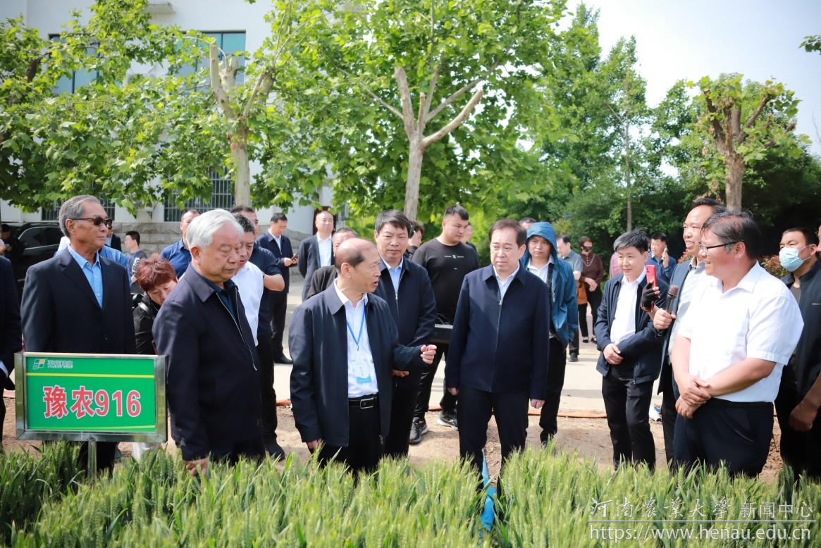 开幕仪式结束后,介晓磊等参加了小麦品种现场观摩会,并查看了我校在全国知名育种专家育种基地种植的30多个小麦新品种(系)。在我校与平安种业有限公司共同选育的高产抗病抗倒小麦新品种豫农916观摩示范田,介晓磊认真听取了我校农学院品种育种人殷贵鸿研究员对该品种的详细介绍,并对殷贵鸿团队取得的成绩给予充分肯定,希望该团队再接再厉,多出大品种、好品种,为学校事业和种业振兴做出更大贡献。下午,我校郭天财教授主持了焦作(温县)第六届小麦种子产业博览会专家论坛,许为钢、周继泽、殷贵鸿、吴政卿等专家学者进行了主题讲座,共谋小麦种子产业发展。