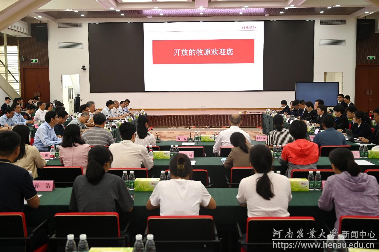秦英林介绍了公司理念、文化内涵、发展现状、取得的成绩、面临的挑战及科技和人才需求情况,并表示希望双方在“农大牧原畜牧产业联合研究院”的基础上进一步加强合作,在新产品新技术研发、科技项目联合攻关、成果申报与转化和人才培养模式方面有所创新和突破,共同实现创建“国际一流农业大学”和“国际一流农牧企业”的双赢目标。牧原集团育种、兽医、营养等部门负责人介绍了相关情况。