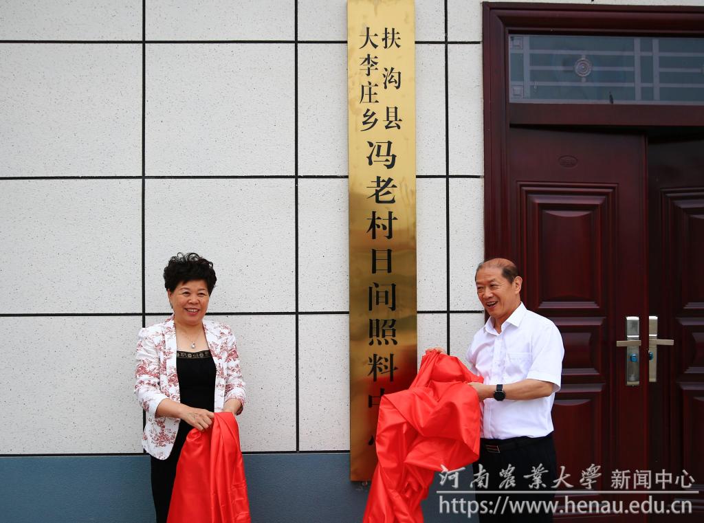 校长介晓磊与扶沟县县委副书记张雪芳共同为冯老村日间照料中心揭牌