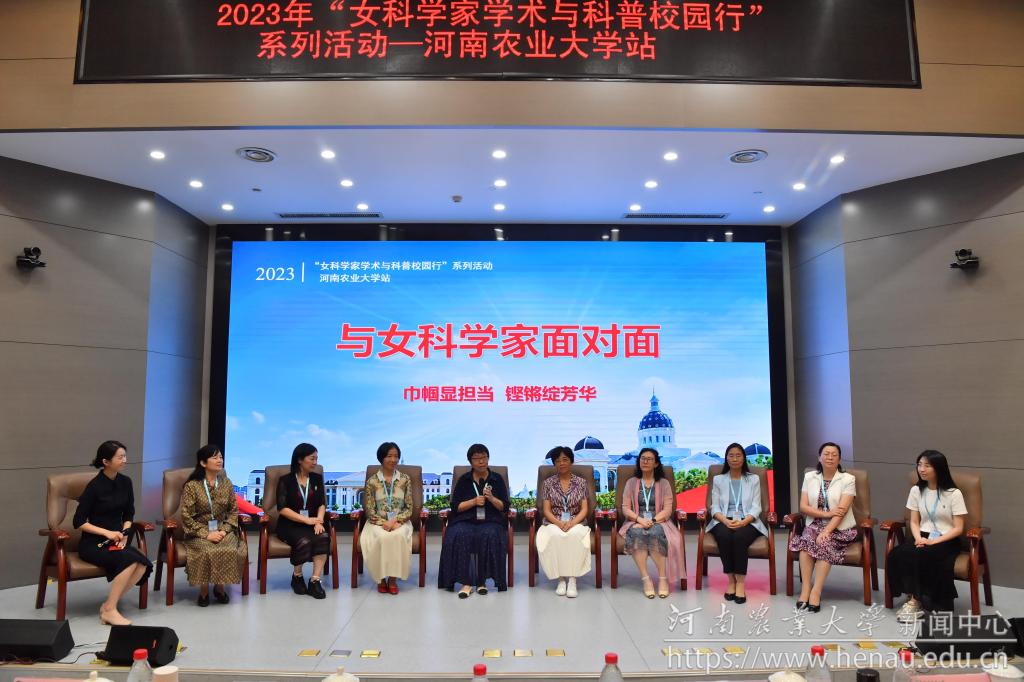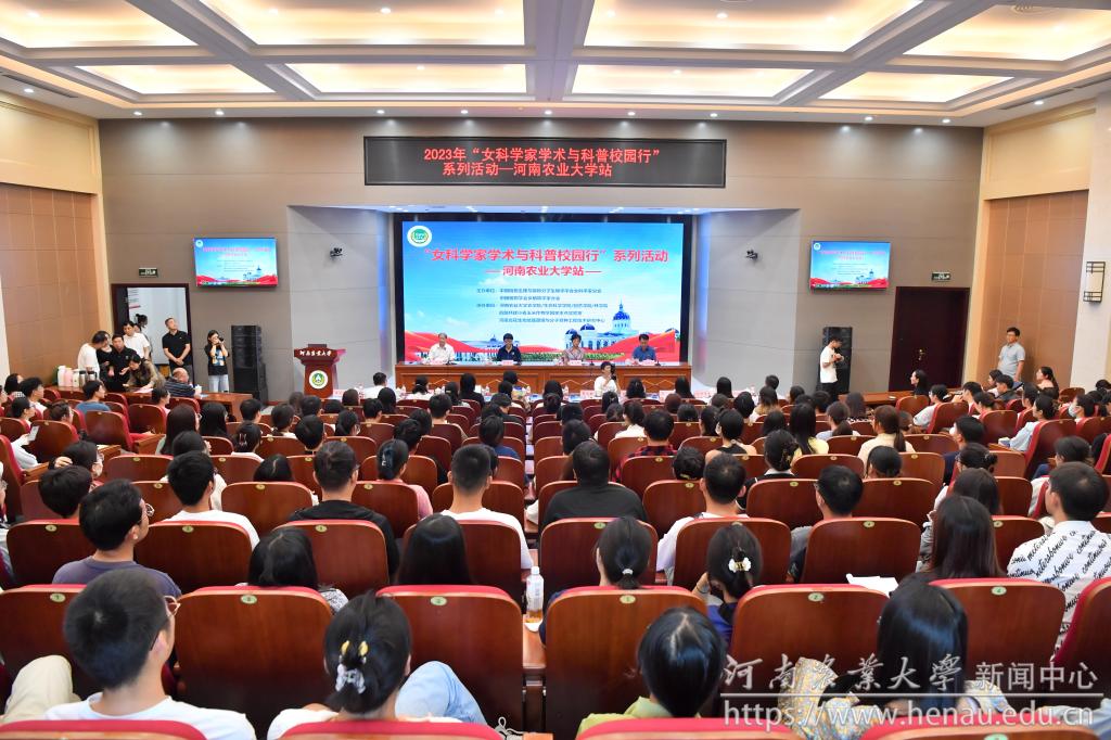本网讯(通讯员 朱瑞萍 图片 孙慧敏)金秋喜谈丰收事,巾帼共话农业情。9月14日,“女科学家学术与科普校园行—河南农业大学站”系列活动在我校龙子湖校区举办。本次活动由中国植物生理与分子生物学学会女科学家分会和中国植物学会女植物科学家分会主办,河南农业大学农学院、生命科学学院、园艺学院、林学院、省部共建小麦玉米作物学国家重点实验室和河南省花生功能基因组与分子育种工程技术研究中心共同承办。校长介晓磊,学术副校长王道文、汤继华出席本次活动。中国科学院院士、中科院遗传发育所研究员曹晓风,山东大学教授夏光敏,中科院植物所研究员田世平,福建农林大学教授廖红,北京师范大学教授任海云,武汉大学教授赵洁,山东大学教授向凤宁,河南大学教授孙世勇及河南农业大学教授殷冬梅等9位杰出的女科学家到校参与活动。农学院、林学院、园艺学院、生命科学学院负责人和300余名相关专业师生参会。