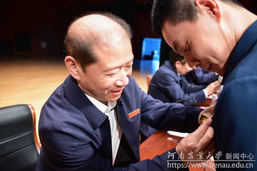 与会领导为新进教职工代表佩戴校徽,新进教职工进行了集体入职宣誓。