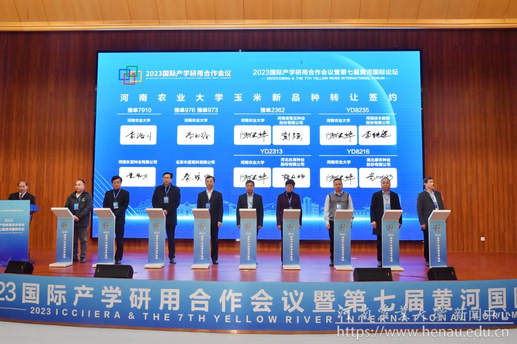 开幕式上,河南农业大学玉米新品种选育人汤继华、李玉玲、李浩川分别与北京丰度高科有限公司、湖北康农种业股份有限公司、河南省豫玉种业股份有限公司、河北兆育种业股份有限公司、河南技丰集团股份有限公司、河南东亚友新种业科技有限公司等企业代表现场进行签约。本次签约包括豫单7910、豫单973、豫单2362等7个新品种,以及育种专利技术转让与联合研发经费,总计5160万元。