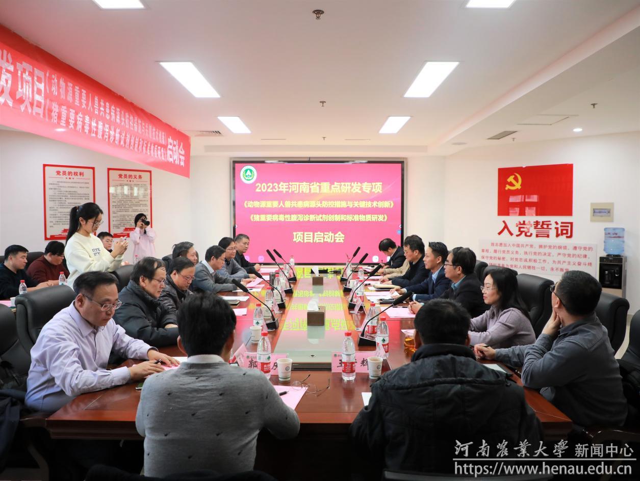 本网讯(通讯员 李俊强 毛梓丞 图片 朵晓文)12月8日,河南省重点研发项目“动物源重要人兽共患病源头防控措施与关键技术创新”和“猪重要病毒性腹泻诊断试剂创制和标准物质研发”项目启动会在龙子湖校区召开。河南省科技厅农业农村科技处处长李锦辉,副校长刘晓永出席会议。新乡学院教授刘兴友,河南牧业经济学院教授李文刚、向瑞平,河南省农业科学院研究员白献晓,河南科技学院教授胡建和,河南省兽药饲料监察所研究员吴宁鹏等专家学者,科技处、动物医学院负责人及相关专家参加会议。