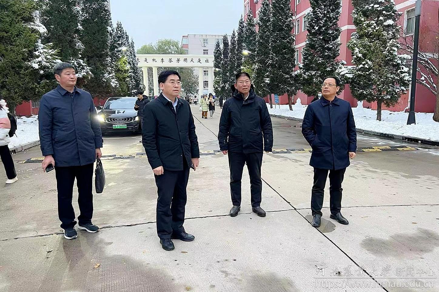 本网讯(通讯员 刘全军 图片 刘明阳)12月11日,郑州突降大雪。副校长郭战伟带队到文化路校区和桃李园学生公寓进行校园安全工作调研。校长办公室、后勤处、保卫处负责同志随行调研。