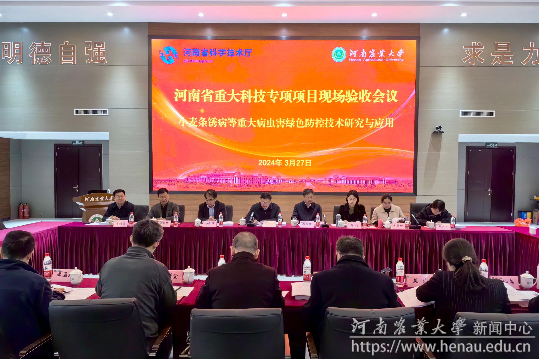本网讯(通讯员 孙炳剑 图片 王利民 牛文龙)3月27日,省科技厅组织中国农业科学院、西北农林科技大学、郑州大学、河南大学等单位专家来校对植物保护学院李洪连教授主持的河南省重大公益性科研专项“小麦条锈病等重大病虫害绿色防控技术研究与应用”进行验收。校党委副书记何松林,省科技厅现代农业农村处处长李锦辉出席会议。科技处、植物保护学院负责人,我校农学院、植物保护学院、省植物保护检疫站、省农科院植保所、河南科技大学、河南丰德康种业有限公司等项目参加单位的课题负责人和技术骨干参加会议。