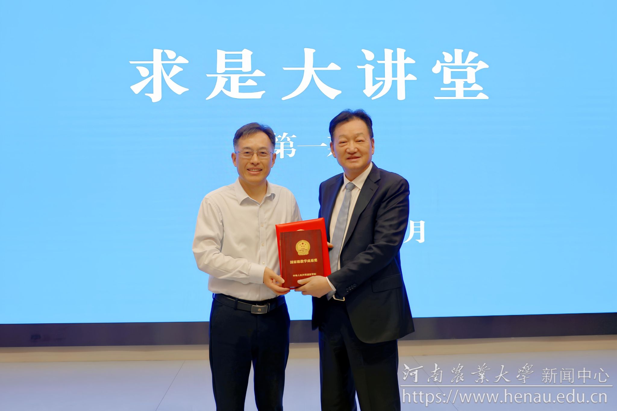 校党委书记李成伟向我校1985级优秀校友、牧原食品股份有限公司董事长秦英林转交获奖证书和奖牌