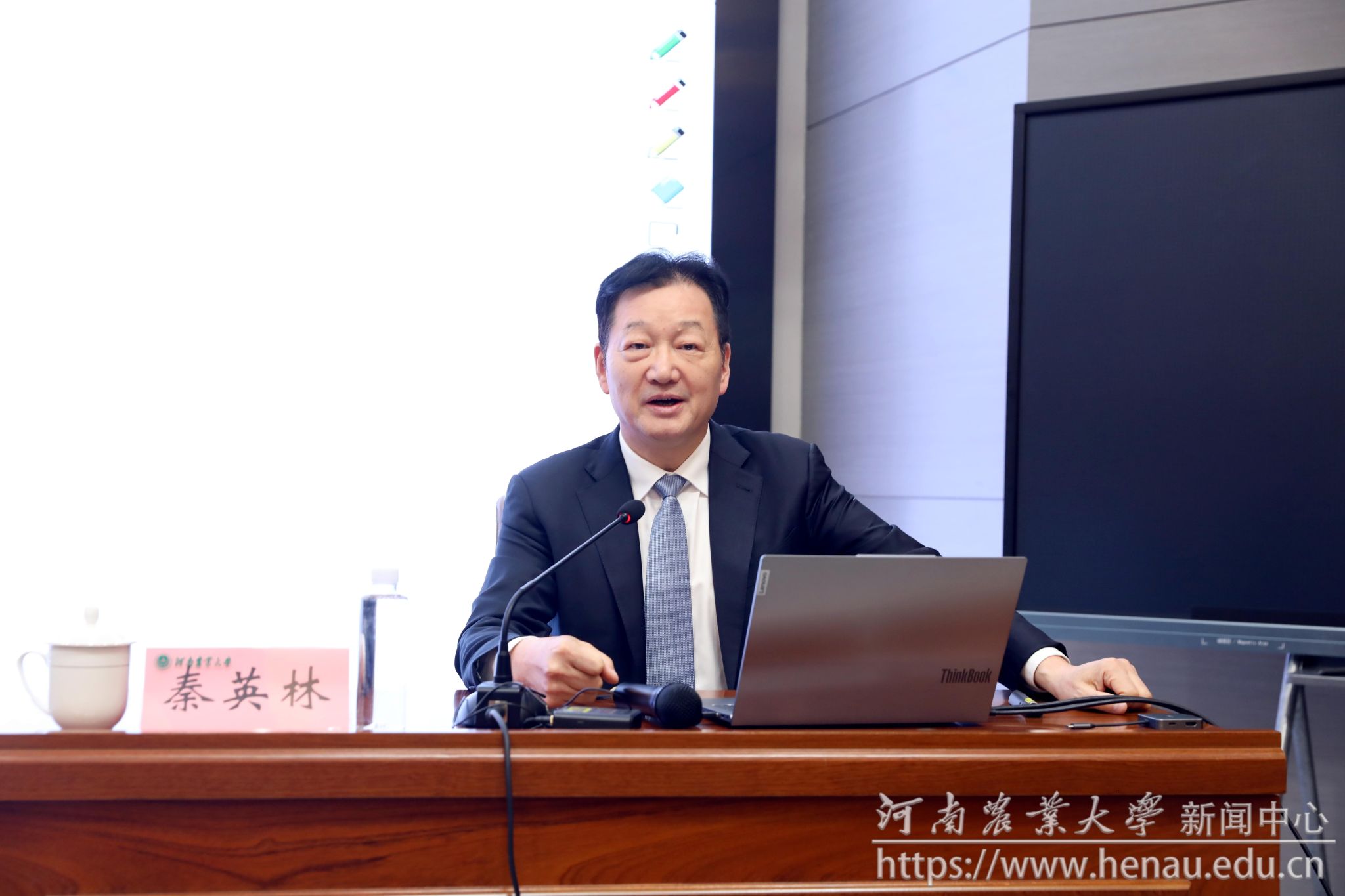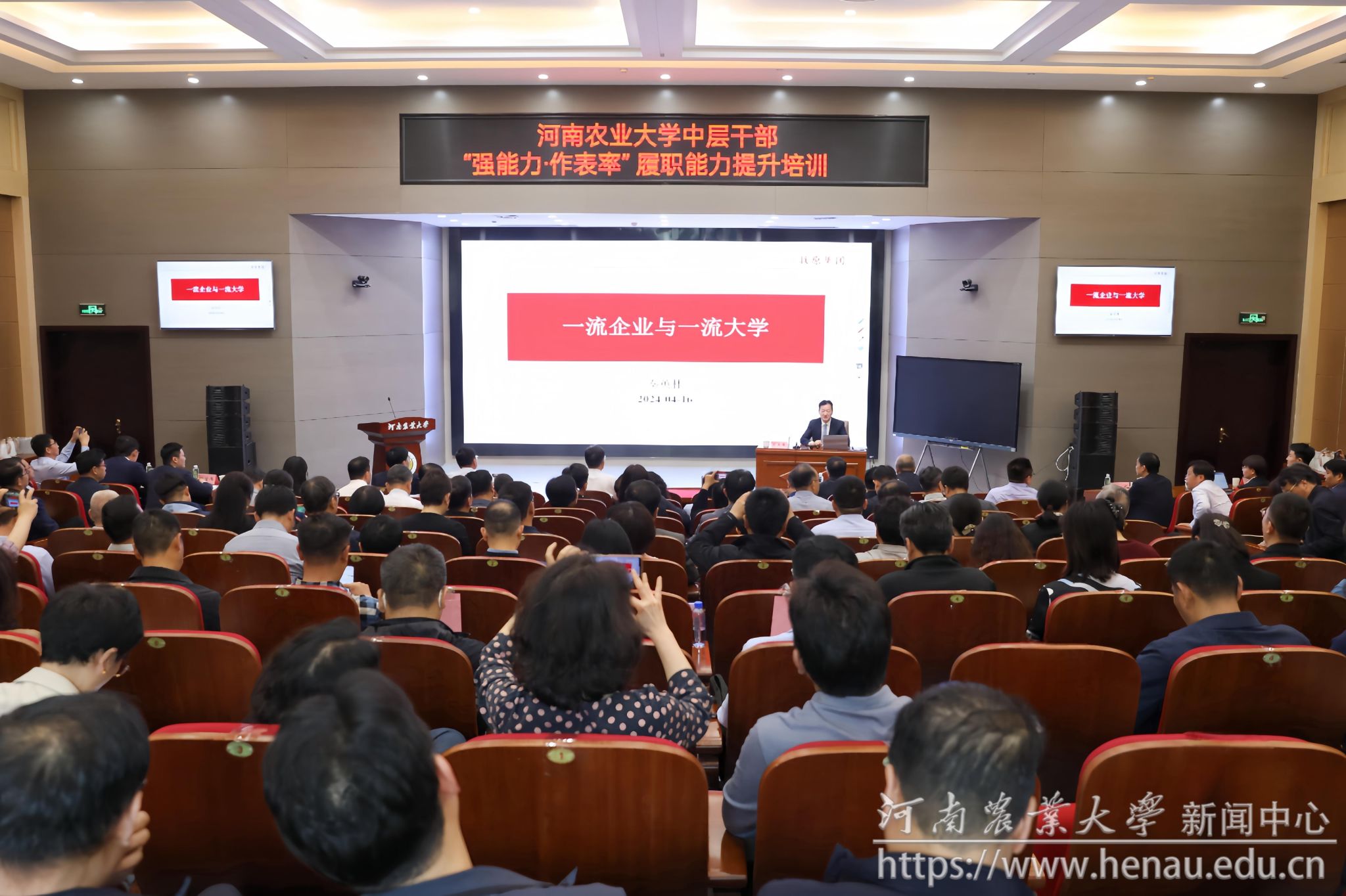 本网讯(通讯员 张世昌 图片 黄璞 李洪振)为深入贯彻落实《全国干部教育培训规划(2023—2027年)》要求,持续推进学校中层干部履职能力提升,4月17日,学校“求是大讲堂”首场讲座在龙子湖校区开讲。我校1985级优秀校友、牧原食品股份有限公司董事长秦英林受邀作《一流企业与一流大学》主题报告。全体校领导、河南澈蓝环保技术有限公司总经理孙新年、学校中层干部参加讲座。讲座由校党委书记李成伟主持。