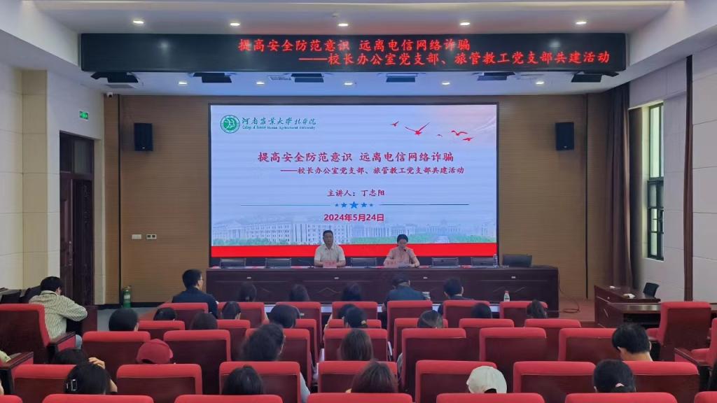 5月24日,校长办公室党支部与林学院旅管教工党支部联合邀请郑州市公安局一级警督、公职律师、业余作家丁志阳于力行楼428报告厅举行以“提高安全防范意识,远离电信网络诈骗”为主题的反诈宣传讲座。校办和林学院相关负责人、林学院旅游管理系部分教职工及学生参加。会议由林学院旅游管理系教工党支部书记何静主持。